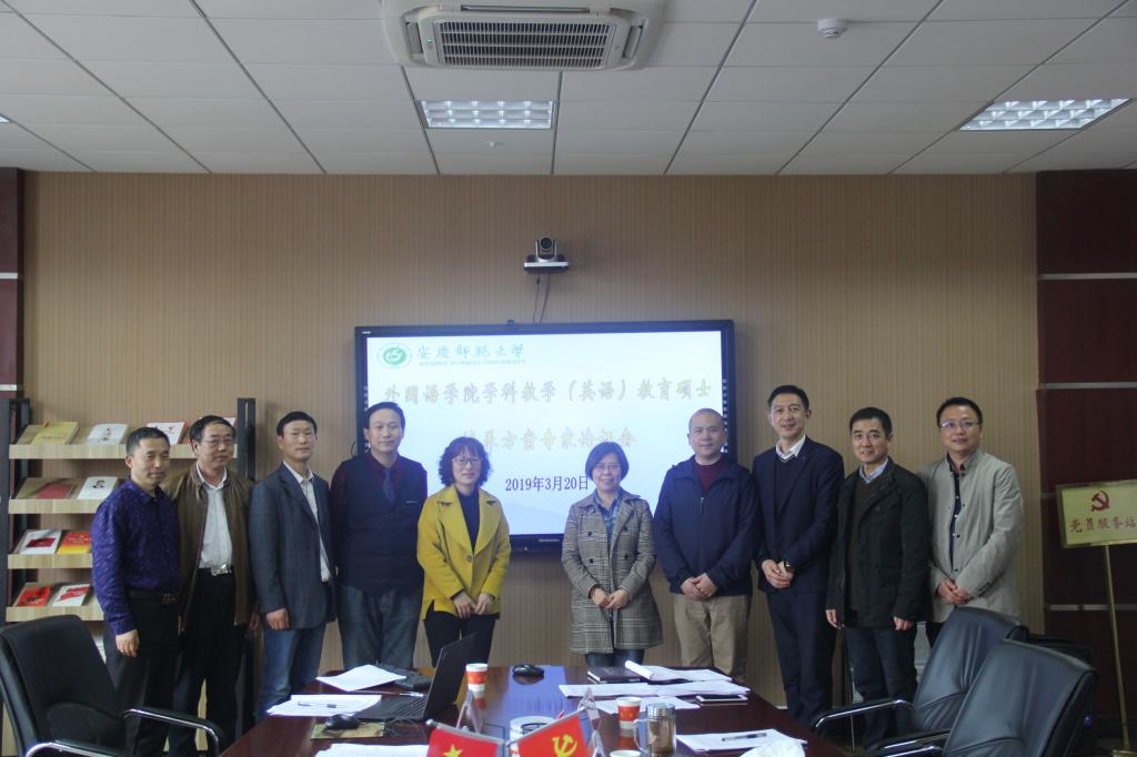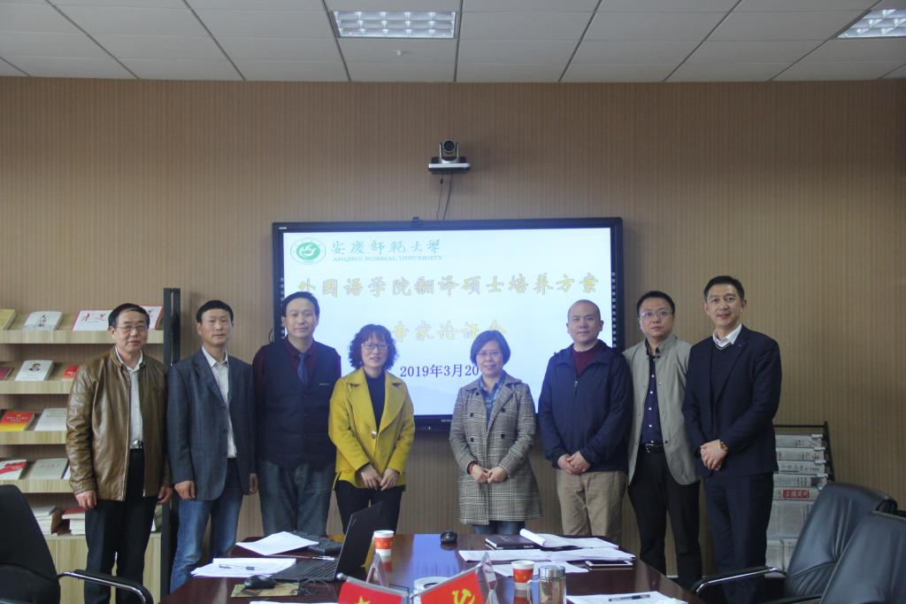 东南大学谈球吧MTI中心主任郭庆、瑞科翻译公司总经理左仁君、安庆市教研室副主任陈俊、安庆市第七中学特级教师檀宜平应邀指导两个学位点培养方案。会议由谈球吧硕士点点长王先荣教授主持。