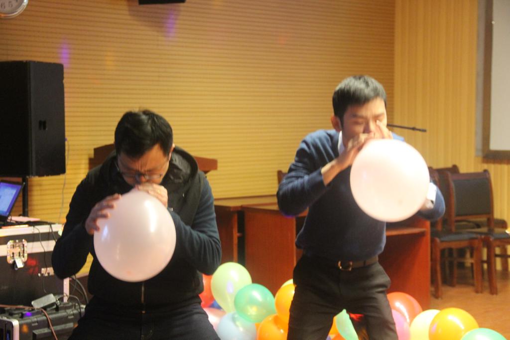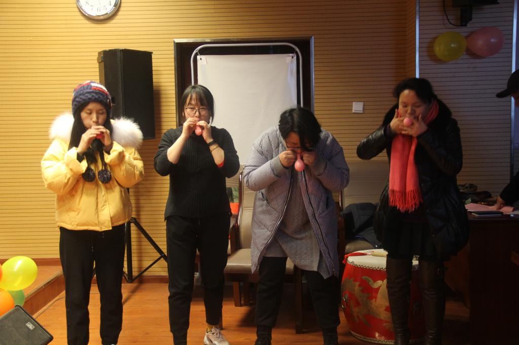 除了既定的表演节目外,现场还开展了临时互动的游戏环节。老师们通过手机软件,积极争抢游戏项目的机会。游戏项目“吹牛皮”让老师们在比拼吹气球的过程中一展教师的“肺活量”。