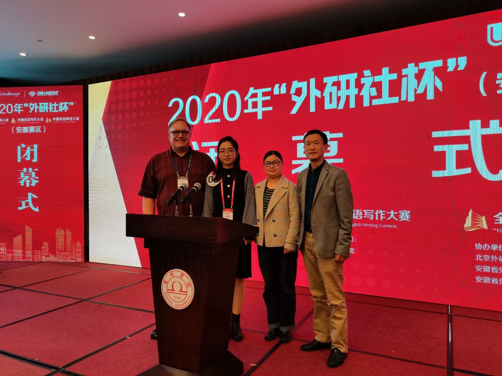 10月31日至11月1日,2020年“外研社·国才杯”全国老员工英语挑战赛系列之英语演讲比赛安徽省决赛在宿州公司隆重举行。来自省内40余所高校的88位选手进行了为期两天的激烈角逐。2017级英语专业徐一凡同学和2018级电子信息科学与技术专业的龙呈瑞昕同学代表公司参加了比赛。两名选手凭借扎实的语言基本功、广博的知识面、极强的现场反应能力喜获佳绩。徐一凡同学决赛排名第二,荣获一等奖;龙呈瑞同学获二等奖。徐一凡同学将代表安徽省参加12月份在北京举行的全国总决赛。