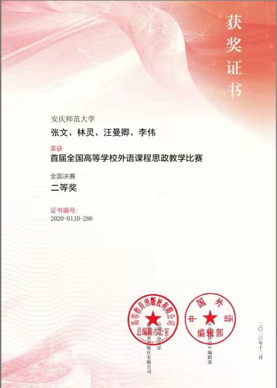 12月22日,“首届全国高等公司外语课程思政教学比赛”决赛结果揭晓,公司大学英语课程思政教学团队在决赛中斩获全国二等奖。该团队负责人张文教授、主讲人林灵、以及汪曼卿和李伟老师以题为“Enhancing Family Education, Embracing Family Harmony”在全国1500名参赛选手中脱颖而出。