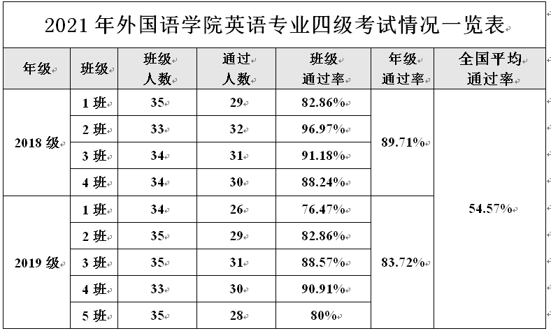 近日,2021年全国高校英语专业四级考试(TEM4)成绩揭晓,谈球吧英语专业2018级136名同学和2019级172名同学参加考试,一次性通过率分别为达89.71%和83.72%,分别超出全国平均通过率(54.57%)近35和30个百分点,其中2018级英语(2)班33位同学仅1人未通过,班级通过率高达96.97%,在近年来公司英语专业四级考试成绩屡夺佳绩的基础上再创历史新高,充分展示了公司英语国家级一流专业建设的成果。
