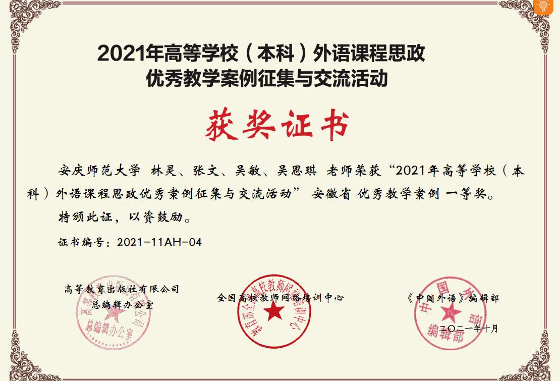 10月8日,由高等教育出版社、全国高校教师网络培训中心、《中国外语》编辑部联合举办的“2021年高等公司外语课程思政优秀教学案例征集与交流活动”结果揭晓,公司大学英语课程思政教学团队林灵、张文、吴敏、吴思琪在决赛中以题为“Integrating Expertise with Values to Better Serve the Motherland”荣获安徽省一等奖。
