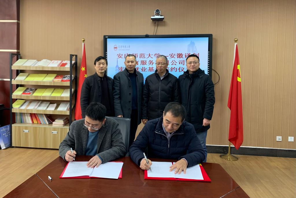 江加宏副经理和安徽译创语言服务有限公司执行总监朱小二代表校企双方签订了实习就业基地协议,王先荣经理和施永双总经理共同为基地揭牌。