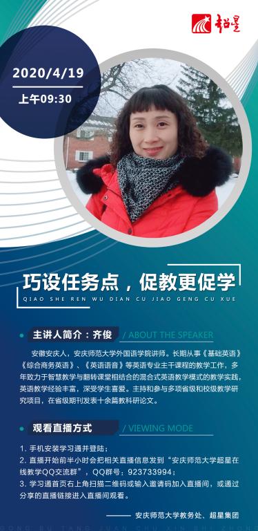 2020年4月19日,公司齐俊老师在线参加了由公司教务处和超星集团联合推出的线上教学交流经验分享活动,为全校教师带来题为“巧设任务点,促教更促学”的专题报告。