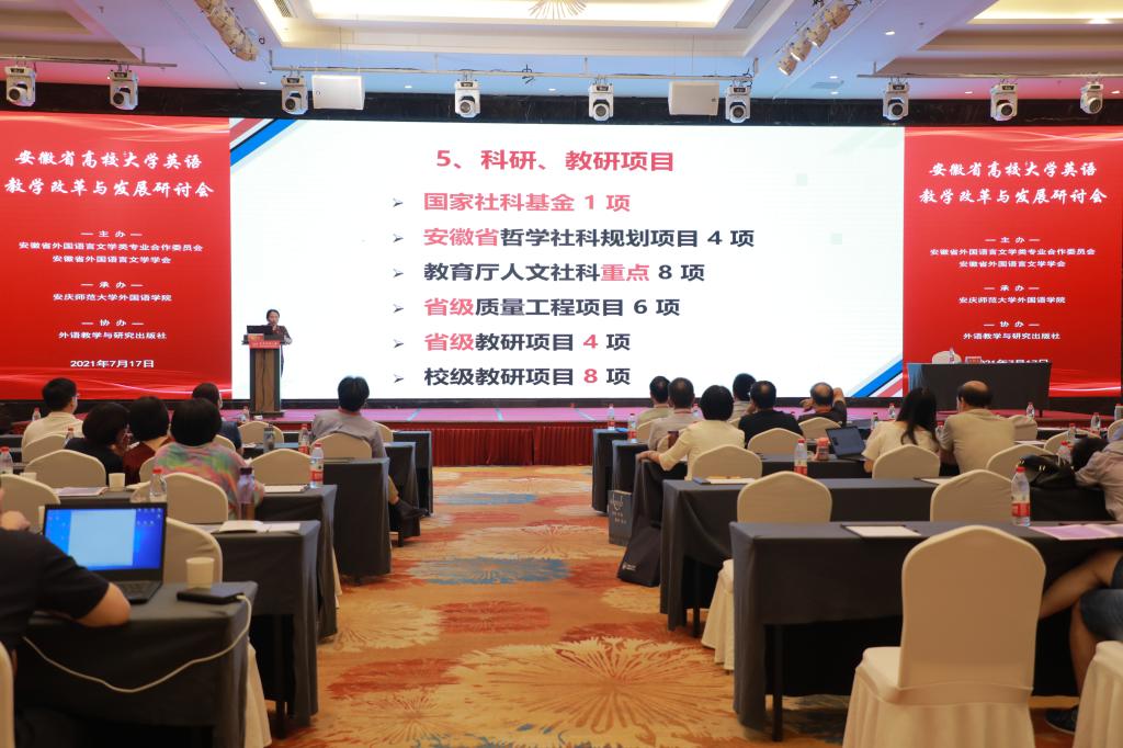 张文在大会上还展示了公司大学英语教研室通过推行教学改革,在教学和科研上取得的丰硕成果:大学英语教研室教授2人,副教授6人,博士1人,博士在读2人。荣获安徽省省级示范教研室、省级大学英语课程思政教学团队;张玮获国家社科基金1项,张文获安徽省哲学社科规划项目2项,瞿宁霞、胡靓分别获安徽省高校优秀青年人才支持计划项目、高校优秀青年骨干人才国内访学研修项目,教育厅人文社科重点项目8项,核心期刊(CSSCI)发表论文11篇;获省级质量工程项目7项,国家级和省级规划教材4部,省级教学成果奖2项,省级大规模在线课程MOOC 1门,省级大学英语课程思政示范课程2项,全国高校外语课程思政教学比赛团队二等奖,外研社“教学之星”大赛获一等奖2项,“外教社杯”全国外语教学大赛一等奖、二等奖2项,全国高校教师外语微课大赛二等奖。指导员工获首届安徽省翻译大赛一等奖,指导员工获全国老员工英语竞赛特等奖8名,一等奖10名,二等奖12名。张文、瞿宁霞、朱忠焰、王巧英分别出版专著和译著4部:《现代安徽作家对十九世纪英国文学的接受》《新媒体在英语教学中的有效应用研究》《黄梅戏经典唱段》《六尺巷》。