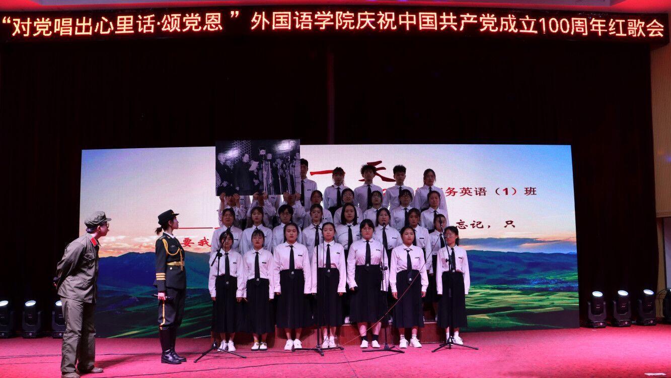 “1949年,我们的新中国成立;1964年,我国第一颗原子弹成功爆发;2001年,我国北京成功申奥;到了2020年,我国实现了全面脱贫……”歌声与历史交织,印有中国取得伟大成就的照片板被缓缓举起。商务英语专业2019(1)班在红歌《有一天》的演绎中,编入一段情景剧,以一位百年前老兵和一位21世纪新兵对话的视角来回顾党的百年发展历程。
