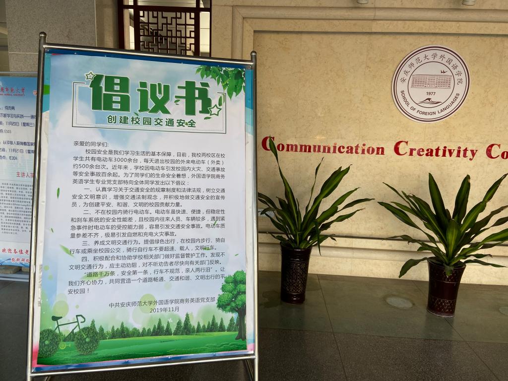 为促进校园交通安全深入人心,谈球吧门口摆有校园交通安全倡议书展板。此外,支部党员还在谈球吧及西苑食堂门口向全校师生分发创建校园交通安全倡议书,大力倡导师生树立交通安全文明意识,增强交通法制观念;养成文明交通行为,绿色出行,在校园内步行、骑自行车或乘坐校园公交;发现不文明交通行为,主动劝阻。