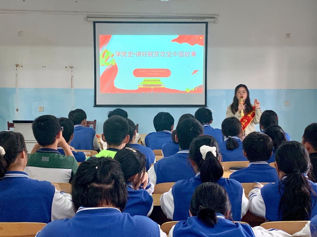 “改革开放史是中国共产党推进社会主义制度自我完善和发展的实践史,正是由于改革开放,新中国迎来了从站起来到富起来、强起来的伟大飞跃;也正是因为改革开放带来的国民经济发展和综合国力提升,为我国全面打赢脱贫攻坚战、全面建成小康社会提供了坚实的经济基础;而决战决胜脱贫攻坚过程中体现出的开拓创新、攻艰克难的精神品质与改革开放精神也是一脉相承的。”宣讲人刘萍说。她向同学们讲述了潜山县乡村教师汪泽红为了改变留守儿童的现状,带头创业发展乡村种植业,带动孩子们的父母回乡就业创业的故事;还有宿松县民间艺术家吴满求依靠民间传统绝活根雕助推当地脱贫致富的故事,每一个乡村成功脱贫的背后都是这样一群敢闯敢试、敢为人先、埋头苦干的人在默默奋斗。