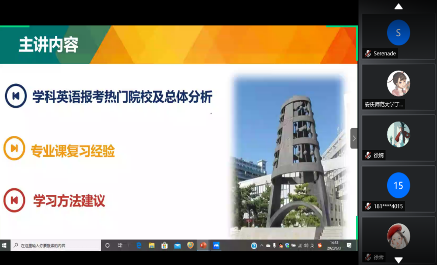 为帮助员工更好地了解考研形式,明确考研规划,掌握备考技巧,6月3日下午,谈球吧依托线上平台成功召开了考研经验交流会,11位2016级员工代表及300余名员工参加了此次会议。