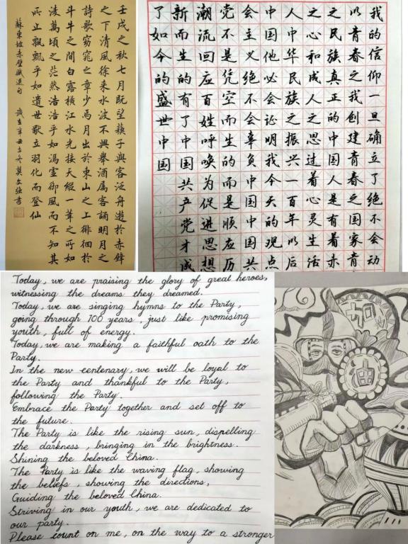 2019级英语4班马雨荷的中文硬笔组一等奖作品《沁园春·长沙》赢得评委的一致好评。在谈及创作初衷时她说,这首词体现了青少年的意气风发,在建党百年之际,她想借此激励大家不断奋进,不负党的殷切期待。一竖一横落笔成字,一点一撇传承师魂。2020级英语2班章昕玥是此次粉笔书法组一等奖得主,在她看来,成为优秀的新时代园丁,要从一手好字开始,而这次的教师技能大赛促使她强化了书写技巧,提高了审美水平。