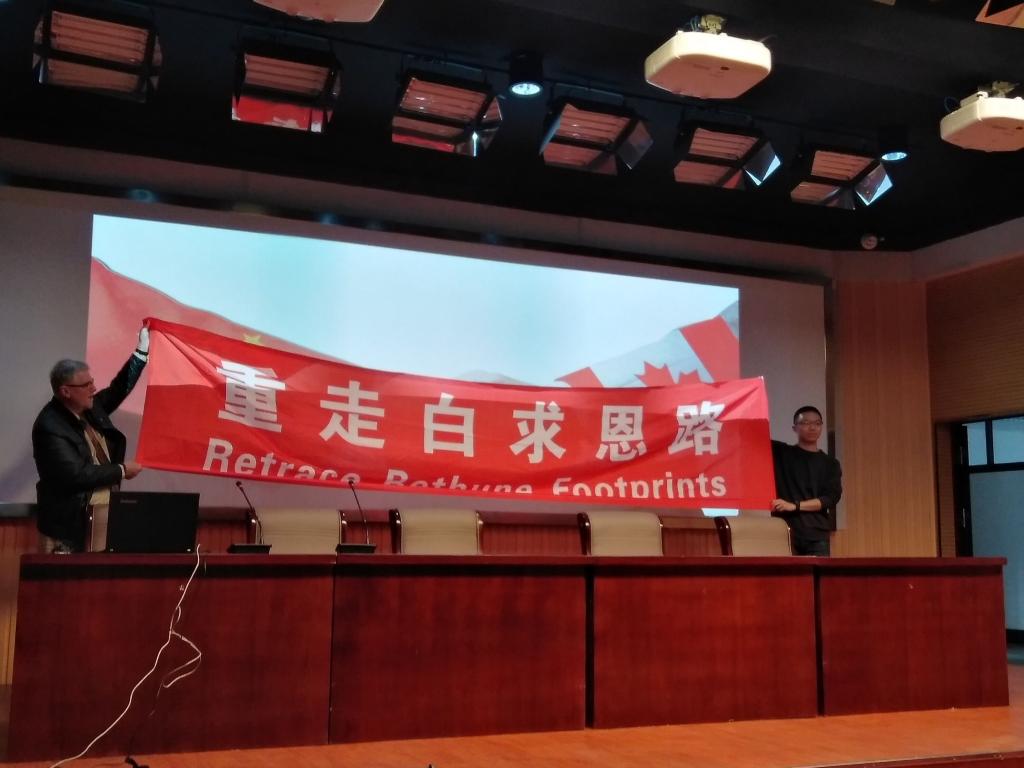 Stephen曾在谈球吧任教八年,此次专门从加拿大来中国回访公司,并特意为谈球吧的学子们准备了这场讲座。本场报告以中加友谊为主题,首先对白求恩同志生平事迹作了简单介绍;紧接着,Stephen详细描述了他探寻白求恩之旅。最后,Stephen强调重走白求恩路,源于中加友谊,亦源于与安庆师大的情谊。