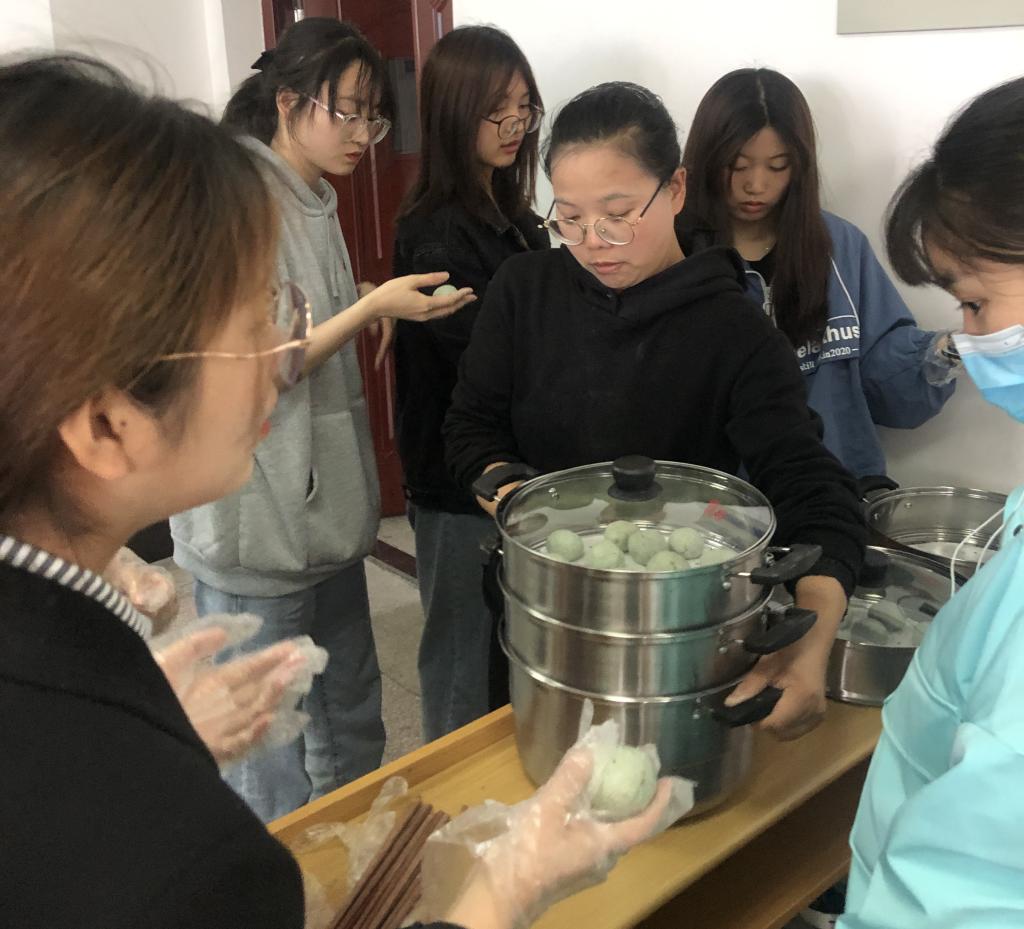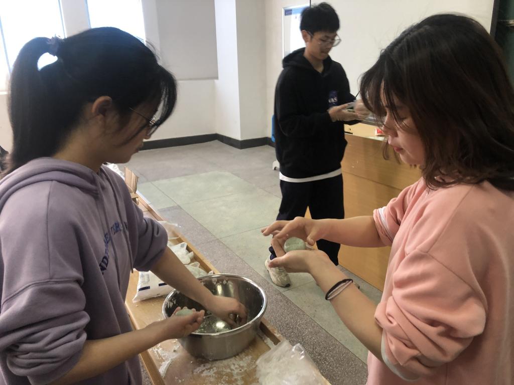 第一次实践课,工作坊为大家准备的是中国传统美食青团的制作。青团是江南地区的传统特色小吃,是用艾草的汁拌进糯米粉里,再包裹进豆沙馅或者莲蓉,不甜不腻,却带有艾草悠长的清香。课程开始,朱兴娟老师向大家详尽介绍青团制作方法,并向大家解释糯米粉、艾草粉、水的融合比例以及蒸煮的最佳时间,随后向大家示范如何揉捏成圆饼状,并包裹适量红豆沙。学员们在观摩结束后,开始分组进行合作实践,共同完成了青团的制作。课堂气氛十分活跃,学员们对中国传统美食的制作充满了兴趣。