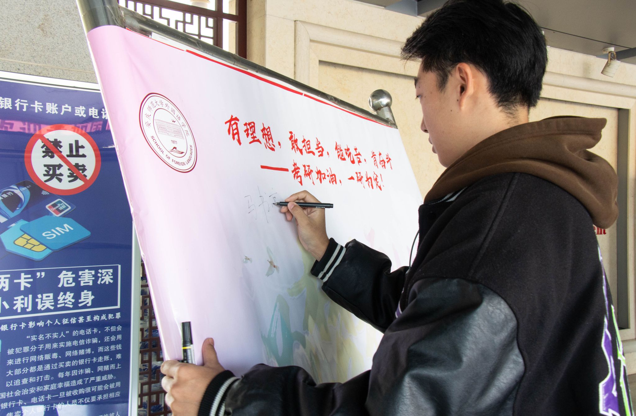 一笔一划,情系暖心加油墙。“我们终将上岸,阳光万里”、“一战成硕!”、“功不唐捐!”公司在一楼大厅设置了“暖心加油墙”,考研学子神情坚定,下笔有神,纷纷在加油墙上写下自己姓名及誓言。在紧张的备考阶段,这有利于帮助他们坚定目标、调整心态、自信面对考试。